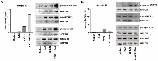 In addition, we could investigate the activation of the pathways ERK1/2 and p38 in two CLL samples that displayed different chemotaxis patterns towards the combination CXCL12 + 2-AG (Figure 9). Both samples displayed an increased chemotaxis towards 2-AG and towards CXCL12 compared with medium alone. However, sample 40 displayed an increased chemotaxis towards the combination of 2-AG and CXCL12 compared to CXCL12 alone (3-fold increase), while sample 41 had a decreased chemotaxis towards the combination (2-fold decrease). Both samples expressed CNR1 and CNR2 (Figure 1C,D), with sample 40 expressing CNR1 at lower levels than B cells from buffy coat and sample 41 expressing CNR1 at a 2.8-fold increase compared to buffy coat B cells. The activation of the signaling pathways seems to be affected by the combination of 2-AG and CXCL12 in the case of Sample 40, but not in sample 41.