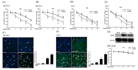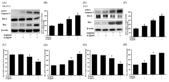 Apoptotic proteins, such as active caspase-3, Bcl-2 or Bax, were then conducted. The apoptotic protein of 20 μM cisplatin in the SK-OV-3 and ES-2 cells with or without si-Zfp90 were determined by western blotting after 24 h treatment. The data highlighted that 20 μM cisplatin significantly increased the active-caspase-3 and Bax, and decreased the Bcl-2 protein expression (*, p < 0.05, versus si-Ctrl group). However, the knockdown of Zfp90 alone did not affect the active-caspase-3, Bax and Bcl-2 protein expression (Figure 3A). Furthermore, the co-treatment of 20 μM cisplatin and si-Zfp90 significantly enhanced the cisplatin-induced up-regulation of active-caspase-3 (Figure 3B) and Bax (Figure 3C), and inhibited the cisplatin-induced down-regulation of Bcl-2 protein expression (Figure 3D) (#, p < 0.05, versus cisplatin group), original blot shown Figure S4. In the ES-2 cell, the data also expressed the same trend. The outcomes implied that 20 μM cisplatin significantly elevated the active-caspase-3 and Bax, and decreased the Bcl-2 protein expression (*, p < 0.05, versus si-Ctrl group). The knockdown of Zfp90 did not affect the active-caspase-3, Bax and Bcl-2 protein expression (Figure 3E). Similarly, the co-treatment of 20 μM cisplatin and si-Zfp90 significantly enhanced the cisplatin-induced up-regulation active-caspase-3 (Figure 3F) and Bax (Figure 3G), and did not affect the Bcl-2 protein expression (Figure 3H) (#, p < 0.05, versus cisplatin group), original blot shown in Figure S5.