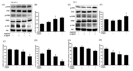 We then evaluated the phosphorylation of p-P38, p-ERK, p-Akt and downstream apoptotic related protein expression to further determine the correlation between Zfp90 and cisplatin sensitization. The protein expression of 20 μM cisplatin in the SK-OV-3 and ES-2 cells with or without si-Zfp90 was identified by western blotting after 1 h treatment. Our data depicted that 20 μM cisplatin significantly increased the p-P38 protein expression and decreased the p-ERK and p-Akt expression (*, p < 0.05, versus si-Ctrl group). The knockdown of Zfp90 alone did not affect the p-P38, p-ERK and p-Akt protein expression (Figure 2A). Furthermore, the co-treatment of 20 μM cisplatin and si-Zfp90 did not affect the cisplatin-induced up-regulation of p-P38 (Figure 2B) and significantly inhibited the cisplatin-induced down-regulation of p-ERK (Figure 2C) and p-Akt (Figure 2D) (#, p < 0.05, versus cisplatin group), original blot shown Figure S2. In the ES-2 cells, the data showed some trend. The outcome indicated that 20 μM cisplatin significantly decreased the p-Akt protein expression and increased the p-P38 protein expression. The knockdown of Zfp90 decreased the p-Akt protein expression (Figure 2E). Moreover, the co-treatment of 20 μM cisplatin and si-Zfp90 only significantly enhanced the cisplatin-induced up-regulation of p-P38 (Figure 2F) (*, p < 0.05, versus si-Ctrl group) and did not affect the p-ERK (Figure 2G) and p-Akt expression (Figure 2D), original blot shown in Figure S3.
