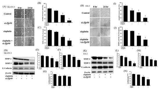 Cell migration was assessed to determine the role of Zfp90 in OC. The anti-migrative effect of si-Zfp90 in the SK-OV-3 and ES-2 cells with or without 20 μM cisplatin were identified by a wound healing assay after 24 h treatment (Figure 4A). The quantitative outcome indicated that 20 μM cisplatin significantly decreased the wound recovery area, more than the si-Ctrl group (*, p < 0.05, versus si-Ctrl group), and the knockdown of Zfp90 alone did not impact the wound recovery area. However, the co-treatment of 20 μM cisplatin and si-Zfp90 significantly enhanced the cisplatin-induced anti-migrative effect (Figure 4B) (#, p < 0.05, versus cisplatin group). We also conducted matrix metalloproteinases (MMPs) activity and migrative-related protein expression to confirm the anti-migrative effect of inhibiting Zfp90 in the molecule level. The MMPs activity and protein expression of si-Zfp90 in the SK-OV-3 and ES-2 cells with or without 20 μM cisplatin were observed after 24 h treatment. Our data showed that 20 μM cisplatin significantly decreased the MMPs activity (from 100.6 ± 4.5 to 57.0 ± 5.6) (*, p < 0.05, versus si-Ctrl group) and the knockdown of Zfp90 alone did not affect the MMPs activity. Furthermore, the co-treatment of 20 μM cisplatin and si-Zfp90 significantly inhibited the cisplatin-induced down-regulation of the MMPs activity (from 57.0 ± 5.6 to 33.8 ± 6.6) (Figure 4C) (#, p < 0.05, versus cisplatin group). We also determined the migrative-related proteins, including MMP-2, MMP-9 and E-cadherin expression. Our data demonstrated that 20 μM cisplatin significantly decreased the MMP-2, MMP-9 and E-cadherin protein expression (*, p < 0.05, versus si-Ctrl group) and the knockdown of Zfp90 only affected the E-cadherin protein expression (Figure 4D) (*, p < 0.05, versus si-Ctrl group). The co-treatment of 20 μM cisplatin and si-Zfp90 significantly inhibited the cisplatin-induced down-regulation of MMP-2 (Figure 4E) and MMP-9 (Figure 4F), but did not affect the E-cadherin (Figure 4G) protein expression (#, p < 0.05, versus cisplatin group), original blot shown in Figure S6. In the ES-2 cells, we also detected the wound healing assay (Figure 4H). The quantitative result revealed that 20 μM cisplatin and the knockdown of Zfp90 mitigated the wound recovery area significantly more than the si-Ctrl group individually (*, p < 0.05, versus si-Ctrl group). The co-treatment of 20 μM cisplatin and si-Zfp90 significantly enhanced the cisplatin-induced anti-migrative effect (Figure 4I). We also performed MMPs activity and protein expression in the ES-2 cells. Our data showed that 20 μM cisplatin significantly decreased the MMPs activity (from 100.6 ± 4.5 to 65.2 ± 4.5) (*, p < 0.05, versus control group) and the knockdown of Zfp90 did not affect the MMPs activity. In addition, the co-treatment of 20 μM cisplatin and si-Zfp90 significantly inhibited the cisplatin-induced down-regulation of the MMPs activity (from 65.2 ± 4.5 to 40.5 ± 5.3) (Figure 4J) (#, p < 0.05, versus cisplatin group). In terms of protein expression, our data showed that 20 μM cisplatin significantly decreased the MMP-2, MMP-9 and E-cadherin protein expression, and the knockdown of Zfp90 affected the MMP-2 and E-cadherin protein expression (Figure 4K) (*, p < 0.05, versus si-Ctrl group). The co-treatment of 20 μM cisplatin and si-Zfp90 significantly inhibited the cisplatin-induced down-regulation of MMP-2 (Figure 4L), but did not affect the MMP-9 (Figure 4M) and E-cadherin (Figure 4N) protein expression. (#, p < 0.05, versus cisplatin group), original blot shown in Figure S7.