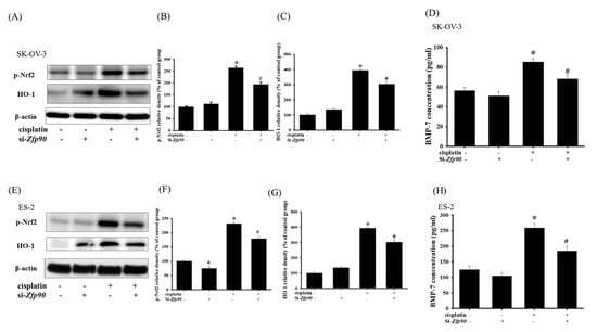 The anti-oxidative stress pathway nuclear factor erythroid 2–related factor 2 (Nrf2)/heme-oxygenase-1 (HO-1) cascade has often been highlighted as being involved in the mechanism of drug resistance. We then tested the associated protein, such as p-Nrf2, HO-1 and bone morphogenic protein-7 (BMP-7). The anti-oxidative effect of si-Zfp90 in the SK-OV-3 and ES-2 cells with or without 20 μM cisplatin were determined by western blotting and ELISA after 24 h treatment. Our data indicated that 20 μM cisplatin significantly increased the p-Nrf2 and HO-1 protein expression (Figure 5A) (*, p < 0.05, versus si-Ctrl group) and the knockdown of Zfp90 alone did not affect the protein expression mentioned above. The co-treatment of 20 μM cisplatin and si-Zfp90 significantly inhibited the cisplatin-induced up-regulation of the p-Nrf2 (Figure 5B) and HO-1 (Figure 5C) protein expression. The cisplatin-induced up-regulation of the BMP-7 concentration was also inhibited (Figure 5D) (#, p < 0.05, versus cisplatin group), original blot shown in Figure S8. In the ES-2 cells, the data showed that 20 μM cisplatin significantly increased the p-Nrf2 and HO-1 protein expression (Figure 5E) (*, p < 0.05, versus si-Ctrl group) and the knockdown of Zfp90 alone did not affect the protein expression mentioned above. The co-treatment of 20 μM cisplatin and si-Zfp90 significantly inhibited the cisplatin-induced up-regulation of p-Nrf2 (Figure 5F) and HO-1 (Figure 5G) protein expression. The cisplatin-induced up-regulation of the BMP-7 concentration was also inhibited (Figure 5H) (#, p < 0.05, versus cisplatin group), original blot shown in Figure S9.