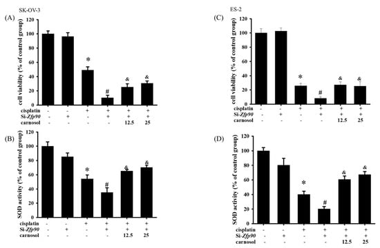 We utilized the HO-1 inducer, carnosol, to revalidate the mechanism of action of Zfp90 in the cell viability and SOD activity. The cell viability of 12.5 and 25 μM carnosol in the SK-OV-3 and ES-2 cells with or without si-Zfp90 or cisplatin were determined by an alamarBlueTM assay in a 24 h treatment. Our data expressed that 12.5 and 25 μM carnosol both significantly reversed the si-Zfp90-induced down-regulation of the cell viability in the SK-OV-3 cells (Figure 6A) (and, p < 0.05, versus si-Zfp90 plus cisplatin group). In terms of the SOD activity, 12.5 and 25μM carnosol both significantly reversed the si-Zfp90-induced down-regulation of the SOD activity in the SK-OV-3 cells (Figure 6B) (and, p < 0.05, versus si-Zfp90 plus cisplatin group). In the ES-2 cells, the same trend was shown. The outcome implied that 12.5 and 25 μM carnosol both significantly reversed the si-Zfp90-induced down-regulation of the cell viability in the ES-2 cells (Figure 6C) (and, p < 0.05, versus si-Zfp90 plus cisplatin group). In addition, 12.5 and 25μM carnosol also significantly reversed the si-Zfp90-induced down-regulation of the SOD activity in the ES-2 cells (Figure 6D) (and, p < 0.05, versus si-Zfp90 plus cisplatin group).