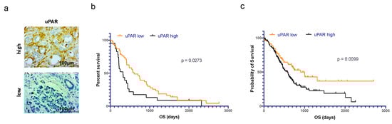 Prognostic significance of uPAR expression in PDAC patients. (a) Exemplary immunohistochemical staining of PDAC with high vs. low expression of uPAR. (b) Statistically significant difference in OS for n = 67 PDAC patients with high (orange, n = 45) vs. low (black, n = 22) immunohistochemical expression of uPAR. (c) Statistically significant difference in OS for n = 83 PDAC patients with high (black) vs. n = 219 patients with low (orange) expression levels of uPAR mRNA (source: TCGA dataset).