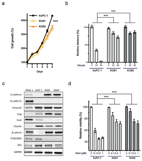 Western blot revealed a marked upregulation of epithelial markers E-cadherin and β-catenin. While the transcription factor Slug was slightly upregulated, Snail and TCF8/ZEB1, together with claudin and ZO1, showed a decreased expression, further indicating the mesenchymal to epithelial transition (MET) in uPAR−/− clones compared to AsPC-1 WT (Figure 2c). In accordance with this phenotype, we detected a marked increase in chemoresistance against up to 1 µM gemcitabine in uPAR−/− cells (Figure 2d).