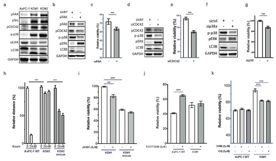 Knockdown of FAK in uPAR−/− cells using siRNAs led to decreased phosphorylation of CDC42, p38, and LC3B, and reactivation of ERK (Figure 3b). The diminished FAK activity also partially restored the sensitivity towards gemcitabine (Figure 3c and Supplementary Figure S3a). Knockdown of CDC42 and p38 also reactivated ERK, decreased LC3B, and increased gemcitabine sensitivity (Figure 3d–g and Supplementary Figure S3b,c). This indicates that CDC42 and p38 suppress ERK activity downstream of KRAS in the absence of uPAR.