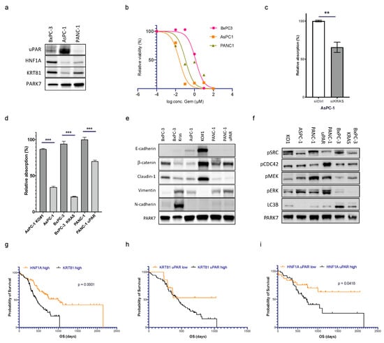 uPAR and mutated KRAS cooperate in maintaining a mesenchymal phenotype that also regulates gemcitabine sensitivity. (a) Immunoblot showing uPAR, HNF1A, and KRT81 expression in BxPC-3, AsPC-1, and PANC-1. Uncropped Western blot images available in Supplementary File S1 (b) IC50 of gemcitabine treatment (0–100 µM, 72 h) in BxPC-3 (1.323 µM), AsPC-1 (0.025 µM), and PANC-1 (0.112 µM). (c) uPAR levels after KRAS siRNA knockdown in AsPC-1 (n = 3 biological replicates, ** Student’s t-test, p < 0.01, *** Student’s t-test, p < 0.001). (d) Gemcitabine response (0.125 µM, 72 h) in AsPC-1 WT, AsPC-1 uPAR−/− (KO#1), BxPC-3 (KRAS WT), BxPC-3 (KRASmut), PANC-1 (uPARlow), and PANC-1 (uPARhigh). (e) Immunoblot of protein lysates from the same cell lines for EMT markers and (f) pFAK, pCDC42, p-p38, pMEK, p-ERK, and LC3B. Kaplan–Meier curves using mRNA expression data of PDAC from the TCGA cohort. Uncropped Western blot images available in Supplementary File S1. (g) Comparison of PDAC with high expression of HNF1A vs. KRT81. (h) KRT81high tumors with high vs. low expression of uPAR and (i) HNF1Ahigh tumors with high vs. low expression of uPAR (log-rank test, p < 0.05).