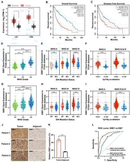 GBE1 expression was associated with the malignancy of gliomas. (A) Differential expression analysis of GBE1 in gliomas according to the GEPIA database (n-LGG = 518; n-GBM = 163; n-Normal = 207). (B) Overall Survival and (C) Disease-Free Survival of patients with GBE1-Low and GBE1-High gliomas according to the GEPIA database (n-low = 338; n-high = 338). GBE1 expression is classified by WHO grade, IDH mutation status, and 1p/19q co-deletion in the TCGA (n = 584) (D–F) and CGGA (n = 686) (G–I) databases. (J,K) Representative images of IHC staining for GBE1 in glioma specimens and adjacent normal specimens. Scale bar: 50 μm (below). (L) ROC curves for distinguishing glioma grade using GBE1 and Ki67 according to the TCGA (n = 584) database, GBE1: AUC = 0.8915; cut-off value = 3.035 (FPKM); sensitivity = 79.72%; specificity = 83.71%, KI67: AUC = 0.7421; cut-off value = 1.297 (FPKM); sensitivity = 79.72%; specificity = 63.12%. Data are presented as mean ± SD (ns p > 0.05; * p < 0.05; ** p < 0.01; *** p < 0.001; **** p < 0.0001).