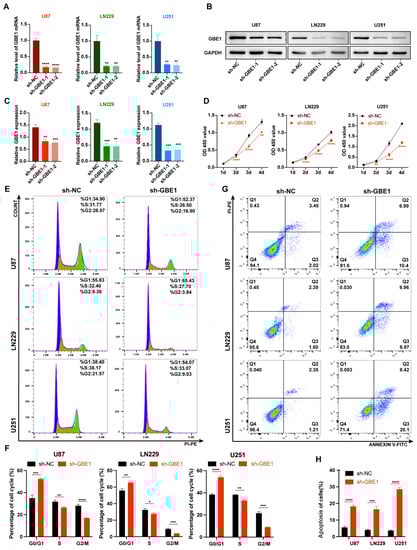 GBE1 knockdown inhibited glioma cell proliferation and induced cell cycle arrest and apoptosis. (A) The knockdown efficiency of two different lentiviral sequences analyzed by qRT-PCR in U87, LN229, and U251 cell lines (n = 3). (B,C) The knockdown efficiency of two different lentiviral sequences was analyzed by Western blot in three glioma cell lines (n = 3). Original blot see Supplementary Materials. (D) Cell viability of three glioma cell lines with GBE1 knockdown compared to the negative control. The OD 450 value was measured by the CCK-8 assay (n = 6). (E,F) Cell cycle analysis of three glioma cell lines with GBE1 knockdown compared to the negative control. Blue in the histogram represents the G0/G1 phase, yellow represents the S phase, and green represents the G2/M phase. (G,H) Apoptosis detection of the three glioma cell lines with GBE1 knockdown compared to the negative control. The sum of the Q2 and Q3 regions was considered the proportion of apoptotic cells. Cell cycle and apoptosis were detected by flow cytometry (n = 3). Data are presented as mean ± SD (* p < 0.05; ** p < 0.01; *** p < 0.001; **** p < 0.0001).