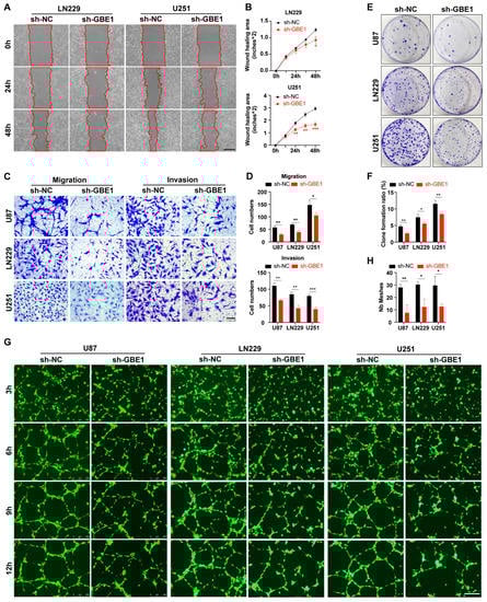 Knockdown of GBE1 affected various biological behaviors of glioma cells. (A,B) Wound healing assay of negative control and GBE1 knockdown ln229 and U251 cells. Photographs were taken every 12 h, and representative images at 0 h, 24 h, and 48 h were selected for presentation. The reduction area of the scratch was calculated as the wound healing area (n = 3). Scale bar: 500 μm. (C,D) Transwell assay of U87, ln229, and U251 cells of the negative control and GBE1 knockdown groups (n = 3). Five fields from top to bottom were selected for each chamber, and the average number of cells from three independent experiments was calculated. Scale bar: 100 μm. (E,F) Colony formation assay of three glioma cell lines transfected with sh-GBE1 compared with the negative control (n = 3). Colony formation ratio = amount of colonies/number of seeded cells. (G,H) Representative real-time images of tube formation assay. Human umbilical vein endothelial cells (HUVECs) were cultured with conditioned media collected from three glioma cell lines with GBE1 knockdown and a negative control (n = 3). Scale bar: 250 μm. Data are presented as mean ± SD (* p < 0.05; ** p < 0.01; *** p < 0.001).