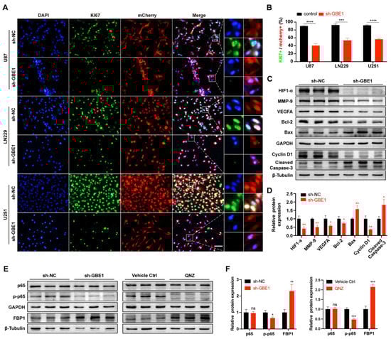 The total protein of glioma cells was extracted with RIPA lysis solution (Thermo Scientific, 89900, Waltham, MA, USA) containing a protease phosphatase inhibitor cocktail (Beyotime, p1045, Shanghai, China) and phenylmethanesulfonyl fluoride (PMSF, Beyotime, p1045, Shanghai, China). Protein concentration was determined using a BCA protein assay kit (Thermo Scientific, 23227, Waltham, MA, USA). Protein samples were separated by sodium dodecyl sulfate-polyacrylamide gel electrophoresis (SDS-PAGE) and transferred to polyvinylidene fluoride membranes (PVDF, Merck Millipore, IPFL85R, Darmstadt, Germany). They were then blocked with a TBST (TBS, 0.1% Tween) solution containing 5% skimmed milk for 2 h at room temperature and incubated with primary antibodies overnight at 4 °C. Finally, they were incubated with horseradish peroxidase (HRP) conjugated secondary antibodies for 1 h at room temperature. Protein bands were developed using an ECL luminescence reagent (Meilunbio, MA0186, Dalian, China). Details of the antibodies are as follows: Anti-GBE1 (Abcam, ab180596, 1:1000, Cambridge, UK), Anti-FBP1 (Affinity, DF7325, 1:1000, Suyang, China), Anti-HIF1α (CST, 36169, 1:1000, Boston, MA, USA), Anti-MMP9 (Affinity, BF0560, 1:1000, Suyang, China), Anti-VEGFA (Abcam, ab46154, 1:1000, Cambridge, UK), Anti-Bcl-2 (Affinity, AF6139, 1:1000, Suyang, China), Anti-Bax (Affinity, AF0120, 1:1000, Suyang, China), Anti-Caspase-3 (Abcam, ab32351, 1:1000, Cambridge, UK), Anti-Cyclin D1 (Affinity, AF0931, 1:1000, Suyang, China), Anti-Cyclin D1 (Affinity, AF0931, 1:1000, Suyang, China), Anti-p65 (Affinity, AF5006, 1:1000, Suyang, China), Anti-Phospho-p65 (Affinity, AF2006, 1:1000, Suyang, China), Anti-GAPDH (Affinity, AF7021, 1:1000, Suyang, China), Anti-beta-Tubulin (Abcam, ab78078, 1:1000, Cambridge, UK), Goat Anti-Mouse IgG (Biosharp, BL001A, 1:5000, Hefei, China), Goat Anti-Rabbit IgG (Biosharp, BL003A, 1:5000, Hefei, China).