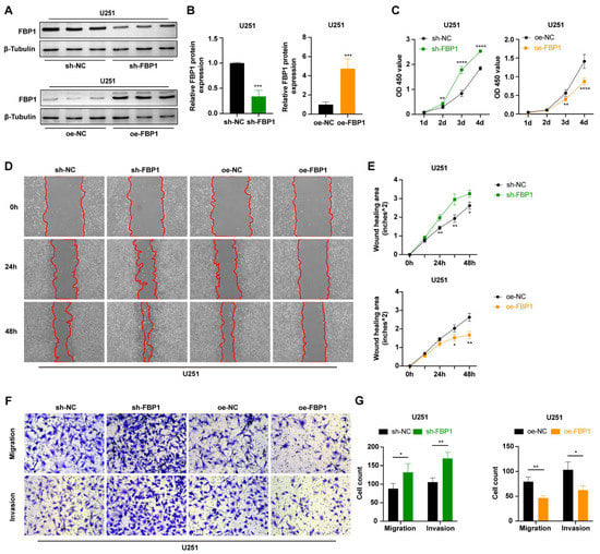 As a tumor suppressor, FBP1 plays a critical role in the progression of multiple tumors [29,30,31]. Given that previous results showed GBE1 negatively regulated FBP1 expression in U251 cells (Figure 4E,F), to further verify the role of FBP1 in gliomas, we constructed U251 cells with FBP1 knockdown (sh-FBP1) and FBP1 overexpression (oe-FBP1). The knockdown and overexpression efficiencies were detected by Western blot (Figure 5A,B). The results of the CCK-8 assay showed that FBP1 knockdown accelerated U251 cell proliferation, while FBP1 overexpression inhibited the proliferation of U251 cells (Figure 5C). Additionally, wound healing assays showed that, compared to the sh-NC group, FBP1 knockdown significantly accelerated U251 cell migration and nearly closed the wound after 48 h migration. Conversely, compared to the oe-NC group, FBP1 overexpression significantly slowed the wound healing rate (Figure 5D,E). Further, transwell assays also showed that FBP1 knockdown significantly increased the number of cells that crossed the transwell membrane, enhancing U251 cell migration and invasion abilities, while FBP1 overexpression inhibited U251 cell migration and invasion (Figure 5F,G). These results indicate that FBP1 is an unfavorable factor for glioma cell proliferation, migration, and invasion. Increasing FBP1 expression helps to suppress these malignant phenotypes in glioma cells.