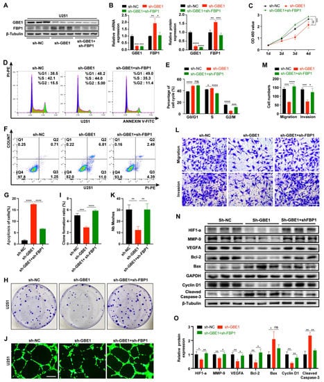 FBP1 knockdown reversed the glioma inhibition caused by GBE1 knockdown. (A,B) Knockdown efficiency of the sh-GBE1 group and sh-GBE1+shFBP1 group in U251 cells was detected by qRT-PCR (Left B) and Western blot (Right B) (n = 3) Original blot see Supplementary Materials. (C) The viability of U251 cells infected with sh-GBE1 or sh-GBE1 + sh-FBP1 was assessed by the CCK-8 assay (n = 6). (D–G) The effects of both GBE1 and FBP1 knockdowns on the cell cycle and apoptosis in U251 cells were assessed by flow cytometry (n = 3). (H–M) Effects of both GBE1 and FBP1 knockdown on cell colony forming ability, angiogenic ability, migration, and invasion ability of U251 cells; (H,I) colony forming ability was evaluated by colony formation assay (n = 3); colony formation ratio = amount of colonies/number of seeded cells. (J,K) Angiogenic capacity was assessed by tube formation assay, and representative images at 12 h were selected for presentation (n = 3); scale bar: 250 μm; (L,M) migration and invasion abilities were evaluated by transwell assay (n = 3); five fields from top to bottom were selected for each chamber, and the average number of cells from three independent experiments was calculated; scale bar: 100 μm. (N,O) Effects of knockdown of both GBE1 and FBP1 on the expression of proteins associated with tumor behavior in U251 cells (n = 3). Original blot see Supplementary Materials; data are presented as mean ± SD (ns p > 0.05; * p < 0.05; ** p < 0.01; *** p < 0.001; **** p < 0.0001).
