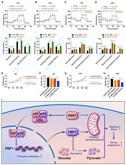 Elevated FBP1 expression caused by GBE1 knockdown induces metabolic reprogramming of glioma cells. (A,B) Extracellular acidification rate (ECAR) of negative control, sh-GBE1, and sh-GBE1 + sh-FBP1 in U87 and U251 cells. The effects of GBE1 and FBP1 on basal glycolysis, glycolytic capacity, and glycolytic reserve in glioma cells were assessed by ECAR. (C,D) Oxygen consumption rate (OCR) of negative control, sh-GBE1, as well as sh-GBE1 + sh-FBP1, in U87 and U251 cells. OCR reflects basal respiration, maximal respiration, and the spare respiratory capacity of glioma cells. Both ECARs and OCRs were detected by the Agilent Seahorse metabolic assay (n = 11). (E,G) Effect of GBE1 knockdown on the viability of glioma cells under hypoxia. (F,H) Cell viability at 24 h of hypoxia was selected for statistical analysis; cell viability was detected by the CCK-8 assay (n = 6). (I) The mechanism of GBE1 regulating the Warburg effect in glioma cells. Data are presented as mean ± SD (ns p > 0.05; * p < 0.05; ** p < 0.01; *** p < 0.001; **** p < 0.0001).