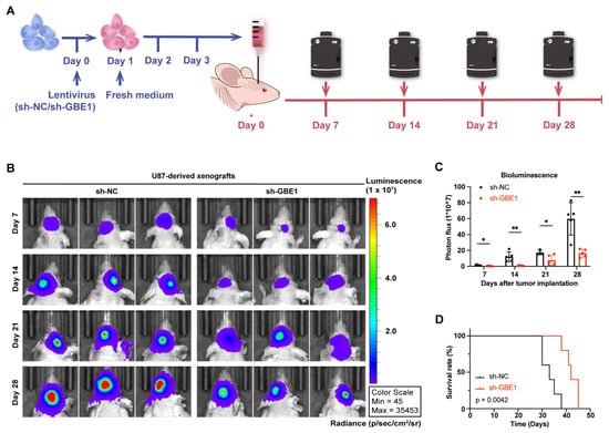 To further investigate the effect of GBE1 knockdown on the growth of glioma cells in vivo, U87 cells carrying a luciferase reporter were transplanted into the striatum of nude mice at day four after sh-GBE1 or sh-NC lentivirus infection. The optical density values of xenografts were recorded every seven days by IVIS in vivo optical imaging system measurements (Figure 8A). The results of the bioluminescence imaging showed that the elimination of GBE1 significantly inhibited the growth of U87-derived xenografts (Figure 8B,C) and conferred a significant survival benefit compared to negative controls (Figure 8D). These results demonstrated that GBE1 knockdown effectively inhibited glioma growth in vivo and improved animal survival.