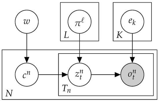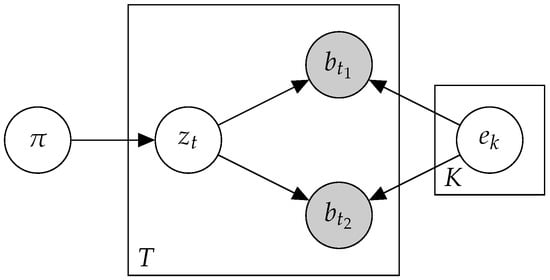 Following the biterm topic model [27], we proposed modeling mutation co-occurrence in a similar way. In detail, the generation of each mutation pair was modeled as a two-step process. First, a signature was chosen from a global, cohort-level exposure vector , and then a pair of mutations was drawn from that signature. The rationale was that, in the case of mutational signatures, the “vocabulary” (mutational categories) was much smaller than that of Twitter. In a targeted sequencing setting, only approximately of a patient’s mutations can be observed. Therefore, modeling the co-occurrence of mutations could provide additional signals as the number of data points (i.e., mutation pairs) would be quadratic for the number of mutations. Furthermore, because the number of mutational categories was low, it would also be computationally feasible.
