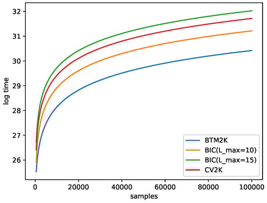 Log running time estimation for Btm2Kand BIC with a maximum of 10–15 clusters and CV2K as a function of the number of samples. Here, was used. For CV2K and Btm2K, was used.