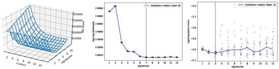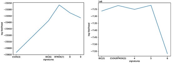 To further show the advantage of the Btm-inspired method Btm2K, we used Mix to compute the likelihood of yet unseen down-sampled WGS/WXS data, with the different numbers of signatures. For each number of signatures chosen, we used BIC to learn the best number of clusters. The results appear in Figure 7 (left panel) and show that seven signatures, as suggested by Btm2K outperformed the other choices. Of interest, eight signatures performed worse than seven signatures, supporting the use of the rollback mechanism in Btm2Kto avoid over-fitting.