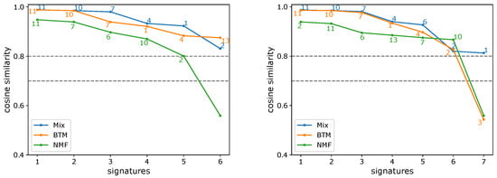 De novo signature discovery of MSK-IMPACT panel data. Shown are the sorted cosine similarities between learned signatures and most similar COSMIC signature (denoted next to the plot) for Mix, Btm, and NMF, across a range of number of signatures (6, 7 corresponding to (left) and (right), respectively). Repeating signatures of the same model are not shown.