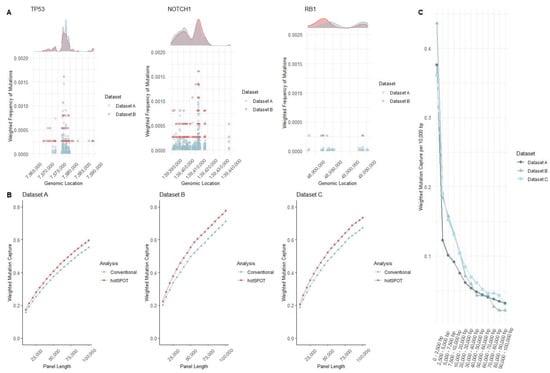 Figure 2. Conceptualization and development of hotSPOT mutation panels. (A) Graphical representation of hotspots in frequently mutated (TP53, NOTCH1) and less frequently mutated (RB1) genes in normal skin in datasets A & B. Dots represent the frequency of mutations at each base pair. The plots above represent the density of mutations for each gene. Densities are normalized for each gene based on the average mutation frequency of the datasets. (B) Comparison of mutation capture efficacy between conventional and forward hotspot binning methods for Datasets A–C. Mutation capture for each dataset is normalized by the number of mutations present in original analysis. (C) Weighted capture efficacy of Datasets A–C ranging from the highest and lowest mutated regions generated by hotSPOT forward binning algorithm.