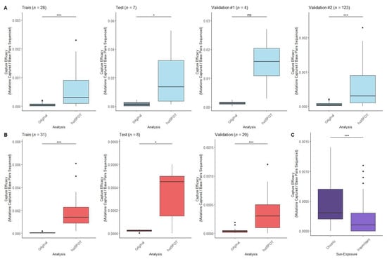 Figure 3. The mutation capture efficiency of hotSPOT for targeted sequencing panel design. (A) Difference in capture efficacy from original sequencing analysis compared to 10,000 bp sequencing panel based on training normal epidermis dataset. (B) Difference in capture efficacy from original sequencing analysis compared to 10,000 bp sequencing panel based on training cSCC dataset. (C) Difference in capture efficacy from chronically sun-exposed and intermittently sun-exposed normal epidermal samples based on 10,000 bp cSCC hotSPOT panel. Statistical significance was calculated using paired Wilcox signed-rank test. Sequencing panels based on forward hotSPOT binning algorithm. (p ≥ 0.05 ns, p < 0.05 *, p < 0.001 ***).