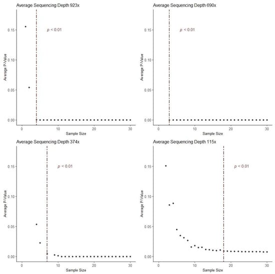 Figure 4. The optimal sample size for effective panel design based on varying sequencing depths 115 – 923×. Statistical significance was calculated using paired Wilcox signed-rank test.