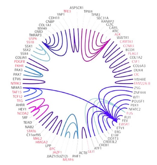 Current sarcoma NGS panel at Cleveland Clinic detects many gene fusions (same color) including 14 involving the EWS gene (Purple at 4 o’clock) [32]. Clinical NGS reports detail which exons are involved in a fusion gene such as EWS-FI1, EWS-ERG, and EWS-WT1. Since January 2022 Caris transcriptome reports are also obtained for additional information.