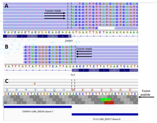 Determination of breakpoint and in-frame analysis to determine polypeptide sequences corresponding to fusion gene products in a single patient with Ewing sarcoma. (A) EWS gene IGV view against hg19 reference genome; (B) FLI1 gene IGV view against hg19 reference genome; (C) fusion reads IGV view against fusion contig reference. The first translational frame is the in-frame fusion with peptide sequence of SSSYGQQNPSYDSV between EWS and FLI1 gene.