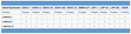 During EBV latent infection phase, expression of the full viral genome is restricted and few viral genes are expressed, leading the virus to escape to its recognition and destruction by the host immune system as well as to remain silent within the host cell. As we mentioned before, there are three forms of latency expressed by EBV-infected cells, each one characterized by a unique expression of EBV-associated proteins and RNAs. Type I latency is associated with the expression of one viral antigen, namely EBNA1 (EBV nuclear antigen-1); type II latency by the expression of EBNA1, LMP1/2 (latent membrane protein) and EBERs (EBV–encoded small RNAs). Lastly, type III latency is associated with the greatest number of viral antigens, namely EBNA 1, 2, and 3, EBNA-LP, LMP-1 and 2, and EBERs (Figure 1) [13,14,15,16]. Type II latency is acknowledged to be associated with Hodgkin’s lymphoma and NPC [15,16].