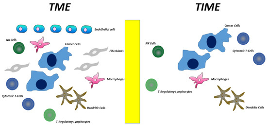 The tumor microenvironment (TME) is the region surrounding the tumor cells. It includes stromal cells such as fibroblasts, endothelial cells, and immune cells as well as non-cellular components such as the extracellular matrix. On the other hand, the tumor immune microenvironment (TIME) refers only to the immune component of the TME and does not include the stromal and extracellular components [29,30] (Figure 2). Both immunostimulating and immunosuppressive cells are present in TIME; the former stimulates an antitumor immune response, the latter inhibits the antitumor immune response and promotes tumor progression. Composition of the TIME strongly depends on the cytokines production during cancer progression. First, cancer cells stimulate an innate and aspecific response mediated by IL-1, IL-6, and TNF-alpha production; this kind of response mainly stimulates macrophages and neutrophil granulocytes to attack the tumor cells. Nevertheless, this aspecific response is not efficient enough at fighting cancer cells. Therefore, then, mainly due to dendritic cells engulfing and exposing TAAs, an adaptive immune response characterized by cytokines production from helper T-lymphocytes is induced. If “the game is conducted” by the TH1 helper lymphocytes (inflammatory), a robust anti-cancer immune response develops and cytokines such as IL-12, IL-2, and IFN-gamma mainly stimulate cytotoxic T-lymphocytes (CTLs) and natural killer cells (NKs) [31,32]. On the other hand, if the mix of cytokines produced (mainly by cancer cells) stimulates the generation of T-helpers other than TH1, for example TH2, Th17, and/or T-Regs (regulatory), the result will be a particularly immunosuppressed TIME, namely rich in T-Regs, M1 macrophages, and myeloid-derived suppressor cells (MDSCs).