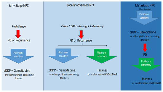 Most NPCs are diagnosed as locally advanced disease, and in this case, the standard treatment is concurrent or sequential chemo-radiotherapy [64]. About half of the patients treated with upfront chemo-radiotherapy experience disease recurrence. The prognosis of the latter is poor and the therapeutic possibilities are fewer. In patients not amenable to surgery or re-irradiation at the site of recurrence, systemic therapy is the gold standard. When choosing systemic therapy, it is strictly necessary to distinguish two categories of patients, namely platinum-sensitive and platinum-refractory patients. The first category includes those who have never undergone chemotherapy (chemo-naive) or those who experience a relapse more than 6 months after the last platinum-containing therapy. The second category includes those who have experienced disease progression/relapse within 6 months of their last platinum treatment [65,66]. In patients considered platinum-sensitive, the gold standard is platinum-based polychemotherapy, and in particular “doublets-containing platinum, namely cDDP-5fluorouracil, cDDP-docetaxel, cDDP-gemcitabine, and CBDCA-paclitaxel. The scheme of choice, based on data from randomized trials, is the cDDP-gemcitabine doublet [67]. In platinum-refractory patients, the therapy of choice is monochemotherapy with taxanes (docetaxel or paclitaxel alone), while nivolumab can be used as an alternative [68]. Figure 4 shows a decision algorithm in a patient diagnosed with NPC.