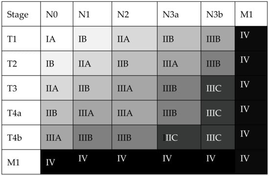 - Amin, M.B.; Greene, F.L.; Edge, S.B.; Compton, C.C.; Gershenwald, J.E.; Brookland, R.K.; Meyer, L.; Gress, D.M.; Byrd, D.R.; Winchester, D.P. The Eighth Edition AJCC Cancer Staging Manual: Continuing to build a bridge from a population-based to a more “personalized” approach to cancer staging. CA Cancer J. Clin. 2017, 67, 93–99. [Google Scholar] [CrossRef] [PubMed]