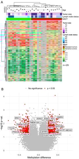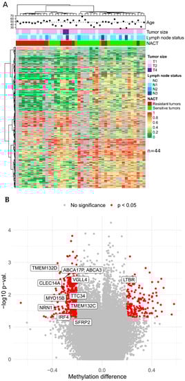 (A) Genome-wide bisulfite DNA sequencing (XmaI-RRBS) results from TNBC samples obtained before neoadjuvant chemotherapy. The heat map shows the level of methylation: red—100%, yellow—50%, green—0%, gray—missing data in NACT-sensitive and -resistant TNBC samples. Each row represents the methylation of a CpG dinucleotide in the samples by column. (B) Volcano plot indicating differentially methylated CpG-dinucleotides in TNBC tumors. X axis represents methylation difference between resistant and sensitive tumor samples; Y axis stands for −log10 scaled nominal p-value. Most informative CpG-pairs revealed by MSRE-qPCR in an independent cohort are marked with gene names they map to.