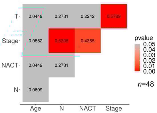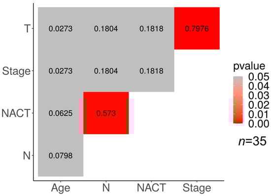 Relationship between clinical characteristics and response to neoadjuvant chemotherapy in TNBC. Significant correlations are marked in red (p < 0.05); numbers show the correlation coefficient.