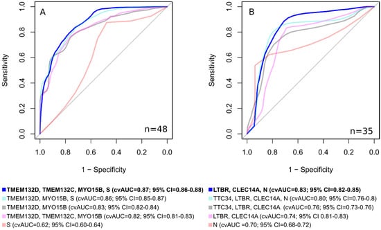 The results of the correlation analysis suggest that the addition of the variable “clinical stage, S” for TN breast cancer, and “lymph node status, N” for luminal B tumors might add to the quality of the developed molecular epigenetic classifiers. We have added S and N predictors to DNA methylation markers for TN and luminal B tumors, respectively, and reevaluated the diagnostic characteristics of the resulting panels (Supplementary Tables S8 and S9 and Figure 5).