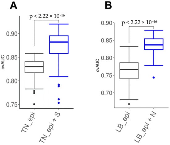 Boxplots for breast cancer NACT sensitivity classifiers, consisting of epigenetic (_epi) and combined epigenetic and clinical predictors (_epi + S, _epi + N) for (A) TN and (B) luminal B (LB) breast tumors.