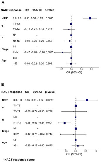 Forest plots indicating the odds ratios for TN tumors’ (A) and luminal B tumors’ (B) NACT response and the corresponding confidence intervals. The higher the odds ratio for NRS, the more likely the patient will demonstrate a positive response to therapy.