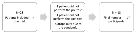 The study was conducted at the Lower Silesian Oncology Center in Wroclaw in two periods: XI 2019–III 2020 and IV–VI 2022 (the break was due to COVID-19 pandemic restrictions). The inclusion criteria were a diagnosis of cancer in the head or neck area and a consent to participate in the study; the exclusion criterion was a diagnosed neurodegenerative brain disease (e.g., Alzheimer’s disease) or stroke. Twenty-eight patients diagnosed with cancer of the head or neck region were included in the study. The study was eventually completed by 18 patients: 11 men and 7 women, ME = 64, SD = 10 (Figure 1). The patients received conventional fractionation 5 times a week, once a day, and the size of the applied irradiation dose ranged between 50 and 70 Gy. Twelve patients additionally received chemotherapy. Details of the characteristics of the subjects included in the study can be found in Table 1. Patient memory testing took place on the day of admission to the hospital (pre-test) and on the day of discharge from the hospital (post-test). The CORSI Block-Tapping test consisted of nine cubes displayed on a monitor screen, placed in a random order. According to the Vienna Test System instructions for the S1 version of the test, the subject is required to reproduce the same sequence of cubes that was previously identified randomly by an automatic pointer on the monitor screen. The test begins with a sequence of three selected cubes, and the length of the series gradually increases. The maximum length of the series for which the test subject obtained two correct repetitions was accepted as the visuospatial working memory score (VSWM), which ranged between of 3–10. The measured parameters were the time required to complete the task, the number of correct sequences, the number of incorrect sequences, any omitted cubes, and any sequence errors. The VR stimulation took place 3 times a week throughout the patient’s hospital stay (6–7 weeks); the exposure time was 15–30 min, depending on the type and complexity of the application. The applications were sourced from the publicly available Oculus Rift movie database. The schedule of the apps used in the project is shown in Supplementary Materials.