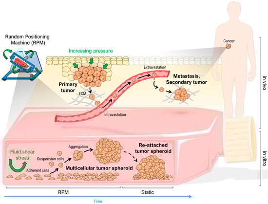 Comparison of metastasis in vivo and random positioning cell culture with adherent growing cancer cells in vitro. Modified from []. Parts of the figure were drawn by using pictures from Servier Medical Art, licensed under a Creative Commons Attribution 3.0 Unported License (https://creativecommons.org/licenses/by/3.0/, accessed on 12 February 2023).