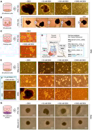 Impact of different DEX concentrations (0, 10, 100, 1000 nM) on spheroid formation and stability of different thyroid epithelial cells after 3 days. (A) Spheroid formation of adherent FTC-133 metastasized carcinoma cells after rotation on the RPM; (B) stability of preformed FTC-133 spheroids on the RPM in the presence of 1000 nM DEX; (C) spheroid formation of FTC-133 suspension cells; (D) origins of the used thyroid cell lines and documented cell line mutations (https://www.cellosaurus.org; accessed on: 2 February 2023). ♂, ♀ indicate the gender of the donor. * The TP53 P223L mutation in WRO cells is only reported by some authors; (E) spheroid formation of adherent Nthy-ori 3-1 thyroid epithelial, ML-1 recurrent and WRO metastasized thyroid carcinoma cells after 3d rotation on the RPM; (F) spheroid formation of FTC-133 and WRO cells in the presence of 10 µM of the p53 reactivator PRIMA-1Met and 1000 nM DEX; (G) spheroid formation of FTC-133 and Nthy-ori 3-1 cells under static forced floating conditions in ultra-low attachment plates. Parts of subfigure D were drawn by using pictures from Servier Medical Art, licensed under a Creative Commons Attribution 3.0 Unported License (https://creativecommons.org/licenses/by/3.0/, accessed on 12 February 2023).