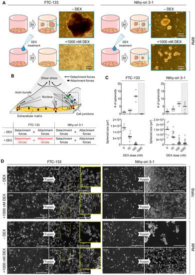 (A) Observed effects of 1000 nM DEX on the RPM-induced spheroid formation of FTC-133 und Nthy-ori 3-1 cells after 3 days; (B) putative reasons for the different behavior of the two cell lines. AJ: adherens junction, FA: focal adhesion, TJ: tight junction; (C) number and size of spheroids formed after 3 days on the RPM depending on DEX concentration; (D) trypsin-based cell detachment assay reveals the general adhesiveness of cells after 24 h of culture in the presence and absence of DEX. The yellow boxes show an enlargement of the outlined section. Scale bars: 300 µm.