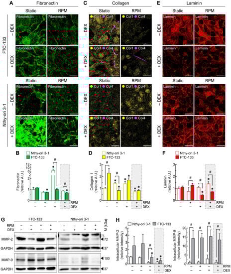Effect of DEX (1000 nM) and random positioning on the ECM of FTC-133 and Nthy-ori 3-1 cells after 3 days. (A) Immunofluorescence of fibronectin; (B) fluorescence-based quantification of fibronectin under the different culture conditions (n = 5); (C) immunofluorescence of collagen I (yellow) and collagen IV (purple); (D) fluorescence-based quantification of collagen I under the different culture conditions (n = 5); (E) immunofluorescence of laminin; (F) fluorescence-based quantification of laminin under the different culture conditions (n = 5); (G) intracellular protein levels of matrix metallopeptidases MMP-2 and MMP-9 indicated by Western blot (see also Supplementary File S1); (H) densitometric quantification of Western blot proteins (n = 3). Scale bars: 300 µm. * p < 0.05 vs. control condition (−DEX/−RPM); # p < 0.05.