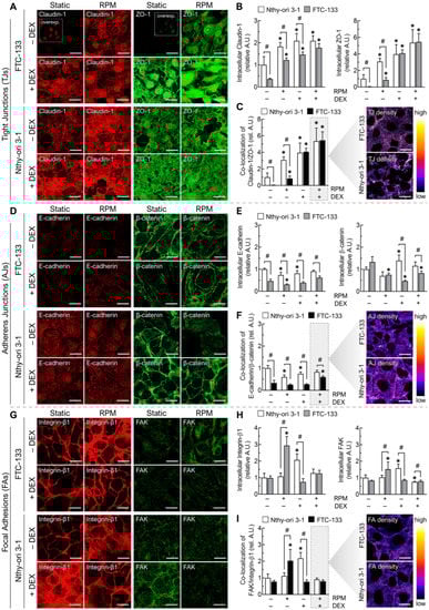 In summary, although FTC-133 cells showed a significant increase in claudin-based TJs and cadherin-based AJs after DEX treatment on RPM, the number of cellular junctions examined in these experiments was not higher than that in Nthy-ori 3-1 cells.