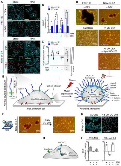 Effect of DEX (1 µM) and random positioning on mucin-1 in FTC-133 and Nthy-ori 3-1 cells after 3 days. (A) Mucin-1 immunofluorescence in adherently growing cells. Mucin-1 is shown in turquoise, with the outlines of the nuclei as dashed lines; (B) fluorescence-based quantification of mucin-1 under the different culture conditions (n = 5); (C) nuclear localization of mucin-1 (n = 5); (D) spheroid formation of FTC-133 and Nthy-ori 3-1 cells in the presence of 1 µM DEX and 5 µM of the MUC1-inhibitor GO-203; (E) hypothetical model that could explain the anti-adhesion of Nthy-ori 3-1 cells during RPM-induced increased mucin-1 expression. Mucin-1 is a transmembrane glycoprotein consisting of two subunits, an extracellular, N-terminal highly glycosylated subunit (MUC1-N) and a C-terminal transmembrane subunit (MUC1-C). MUC1-C can form homodimers that affect cellular signaling pathways and gene expression; (F) spheroid formation of Nthy-ori 3-1 cells in the presence of 5 µM GO-203; (G) MUC-1 immunofluorescence (turquoise) of adherently growing Nthy-ori 3-1 cells in absence and presence of 5 µM GO-203. (H) MUC1-C activates the Wnt/β-catenin pathway and induces MYC expression. TF: transcription factor. (I) Expression levels (mRNA) of the MYC gene (n = 5). Scale bars: 300 µm. * p < 0.05 vs. control condition (−DEX/−RPM); # p < 0.05.