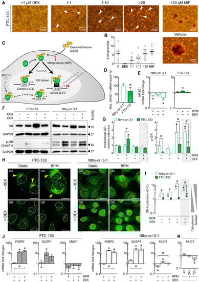 Effect of DEX on the glucocorticoid receptor (GR) and GR signaling in FTC-133 and Nthy-ori 3-1 cells after 3 days. (A) Spheroid formation (white arrows) of FTC-133 cells in the presence of 1 µM DEX and different concentrations (1–20 µM) of the competitive GR inhibitor mifepristone (MIF); (B) number of FTC-133 spheroids formed on the RPM in the presence of DEX and MIF (n = 10). (C) Simplified schematic representation GR’s mechanism of action. The genomic effects of DEX occur through its binding to GR and the movement of DEX-GR to the nucleus, where they can regulate the transcription of genes. GRE: glucocorticoid response element, TF: transcription factor, TFRE: transcription factor response element. (D) Expression levels (mRNA) of the NR3C1 gene (n = 5); (E) fold changes of NR3C1 expression under the different culture conditions (n = 5); (F) intracellular protein levels of GR and phosphorylated GR (p-GR) indicated by Western blot (see also Supplementary File S1); (G) densitometric quantification of Western blot proteins (n = 3); (H) GR immunofluorescence in adherently growing cells. GR is shown in green, with the outlines of the nuclei as dashed lines. In DEX-free FTC-133 cultures, GR is located near the nucleus (yellow arrows). (I) Nuclear localization of GR (n = 5); (J) fold changes in the expression of some signature genes of the GR pathway under the different culture conditions (n = 5); (K) fold changes in MUC1 expression on the RPM after different time points (n = 5). Scale bars: 300 µm. * p < 0.05 vs. control condition (−DEX/−RPM); # p < 0.05.