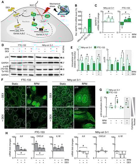 A crosstalk between GR and p38 mitogen-activated protein kinase (MAPK) was reported earlier [,,]. p38 (gene symbol: MAPK14) can be activated by phosphorylation through mechanical forces [] and then either accelerates the activation of GR or migrates to the nucleus, where it can itself affect various transcription factors and thus control the expression of numerous genes (Figure 8A). MAPK14 was expressed about three-fold higher in the cancer cells (Figure 8B), and transcription was upregulated by DEX treatment in both FTC-133 cells and Nthy-ori 3-1 cells. However, downregulation of MAPK14 by random positioning was also observed in FTCs (Figure 8C).
