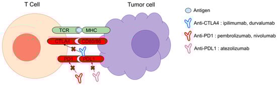 During the last five years, a few clinical trials have been conducted to evaluate ICI in STS, targeting regulators of the immune response by blocking the PD1/PDL1 and CTLA4 axes. In the last decade, ICI have dramatically changed the vision of cancer management by emphasizing the importance of the immune system in cancer growth, contrasting with the previous, inefficient immunotherapy mostly based on the use of vaccines. Each step in T cell-mediated immunity is regulated by counterbalancing inhibitory signals, which are commonly overexpressed in tumor cells or in the tumoral microenvironment. Immune checkpoint receptors expressed by T cells or antigen-presenting cells, such as PD1/PDL1 and CTLA4, when combined to their ligand, induce immune tolerance. ICI are antibodies that target and prevent the inhibitory ligand–receptor interaction and can therefore activate the immune system [11] (Figure 1).