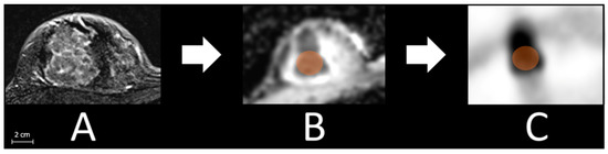 Breast lesion: After defining the malign breast lesion at T1 weighted post-contrast sequence, a tumor size adapted volume of interest (VOI) that adequately captured the breast cancer lesion was set in the ADC map of each patient. Afterward, the VOI was copied to the corresponding PET images to match the identical plane and position. Finally, in both images, a manual reshape was performed to avoid pixel loss (Figure 1).