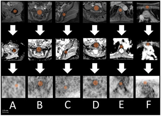 Exemplified measurement processes with locating defined bone regions ((A): right femur, (B): os sacrum, (C): os ilium, (D): L 5, (E): T 7, (F): sternum) in T1 weighted post-contrast sequence ((upper) row), pacing a bone size adapted volume of interest (VOI, orange, max. 2.5 cm os sacrum) centrally in each bone location in the ADC map ((middle) row) and afterward copying the VOI to the corresponding slice of the PET images ((lower) row).