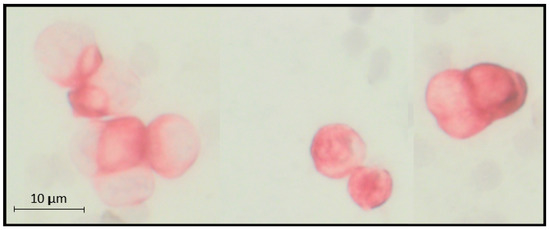 Between 10 and 20 mL BM was aspirated from the anterior iliac crests of all patients at the beginning of surgery of the primary tumor, before the start of any therapy, and processed within 24 h. DTC isolation and detection were performed on the basis of the recommendations for standardized tumor cell detection, published by the German consensus group of Senology [49]. Details of the staining procedure, for example, the number of evaluated slides, controls, and cell detection, have been described elsewhere [50]. Briefly, BM cells were isolated from heparinized BM (5000 U/mL bone marrow) by Ficoll–Hypaque density gradient centrifugation (density 1.077 g/mol; Pharmacia) at 400× g for 30 min. Slides were analyzed for DTCs by immunocytochemistry using the pan-cytokeratin anti-body A45-B/B3 (see Figure 3). Microscopic evaluation of the slides was carried out using the ARIOL system (Applied Imaging, San José, CA, USA), according to the ISHAGE evaluation criteria [51].