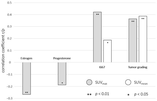 Visualized significant correlations between immunohistochemical markers, tumor grading, and SUVmax (grey)/SUVmean (white) from [18F]FDG-PET/MRI in combination with their correlation coefficients (r/ρ) and p values (** p < 0.01; * p < 0.05).